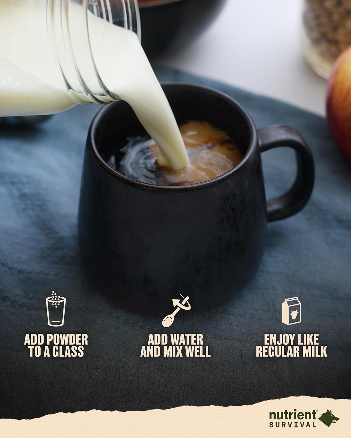 - FEED YOUR FREEDOM: Enjoy Nutrient Survival creamy, non-fat vitamin milk warm or cold. Just add water to the milk powder to get the instant milk ready to use. Nutrient dense powdered milk, a great go-to for both everyday and emergency situations